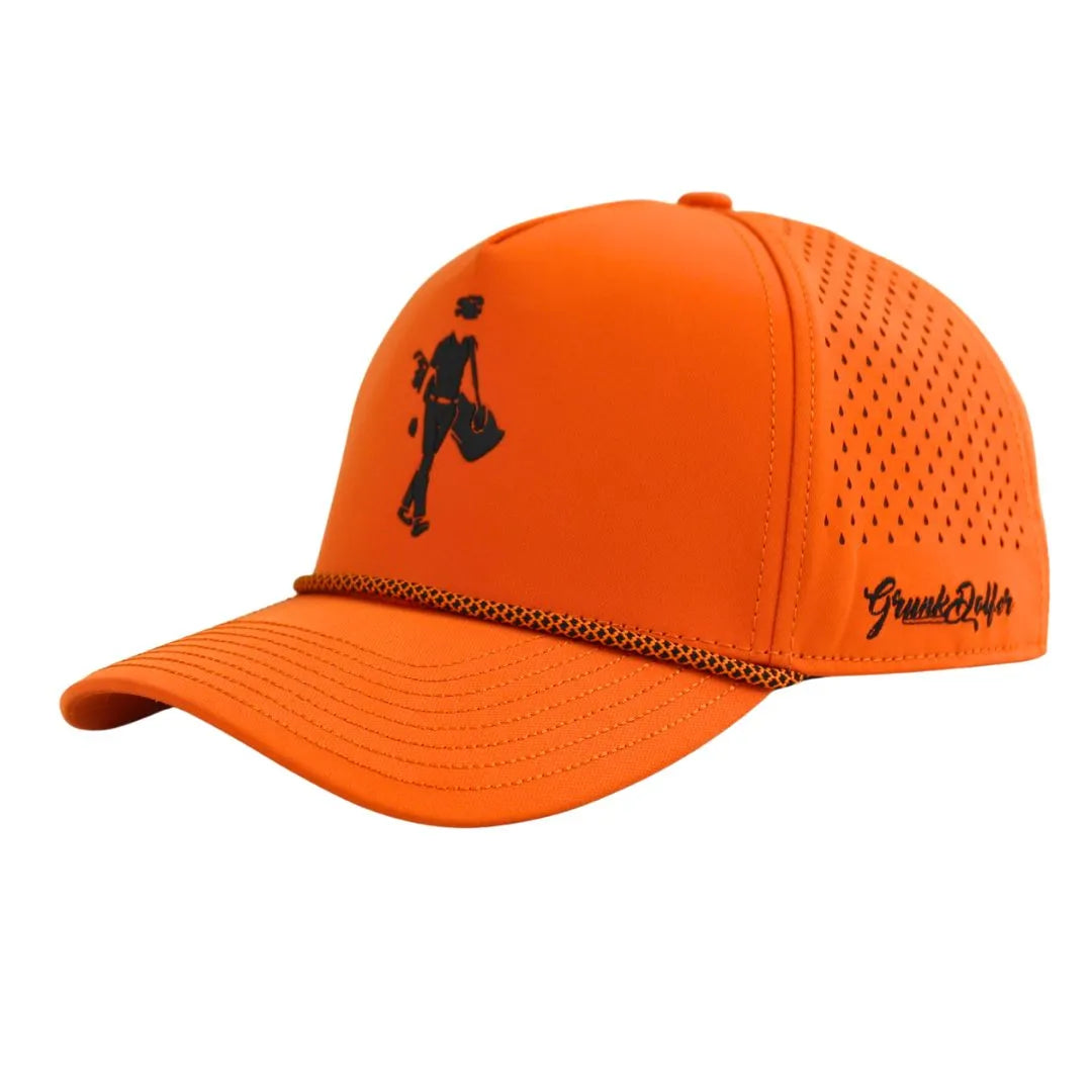 Step onto the course or into the crowd with the Grunk Walker Hat – a bold twist on our classic Grunk style. This vibrant orange cap features our updated avatar, the “Grunk Walker,” striding confidently with a golf bag slung over one shoulder and a beer helmet in hand. Built for those who embrace the game and the good times, it blends playful energy with all-day comfort.