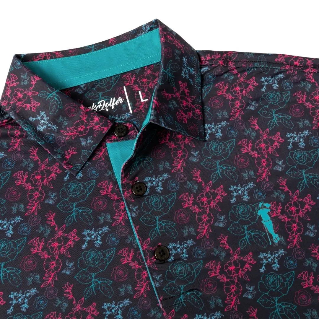 Put a twist on your classic polo with the Neon Rose. Featuring a subtle neon rose design, this was a grunk dolfer original from 2021, reimagined for a modern twist. Keep it cool and quirky with this playful twist on a timeless style.