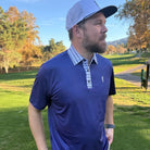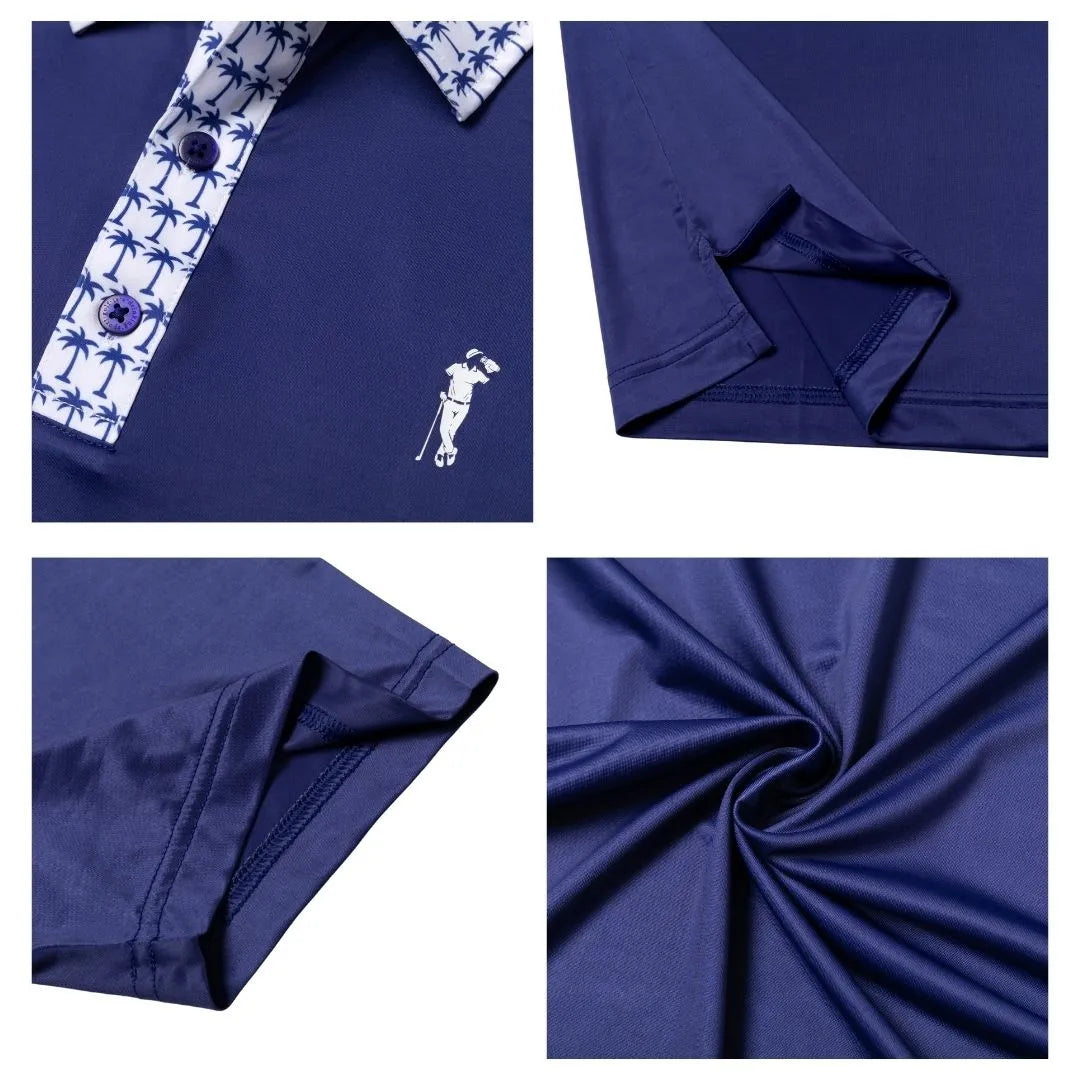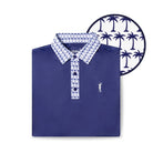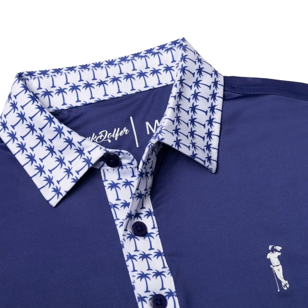 A clean, classic navy polo upgraded with a subtle splash of vacation vibes. The collar is lined with crisp palm tree prints, giving it that perfect hint of tropical cool without overdoing it. Simple, sharp, and effortlessly stylish—your everyday polo with a sunny twist.”