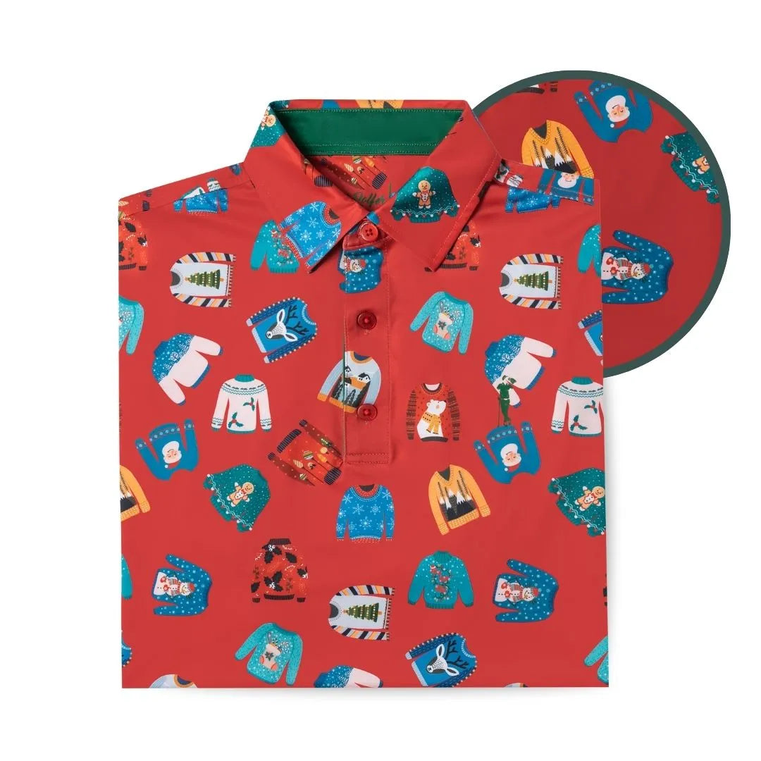 Forget subtle. The Ugly Sweater Polo is full-send holiday spirit, plastered with ugly sweater graphics from collar to hem. Think reindeer, snowflakes, candy canes, gingerbread disasters—basically everything your grandma knit, but way cooler. Built on our performance polo fabric so it stretches, breathes, and parties harder than your office Secret Santa. Perfect for 18 holes, 12 beers, and one questionable karaoke set.